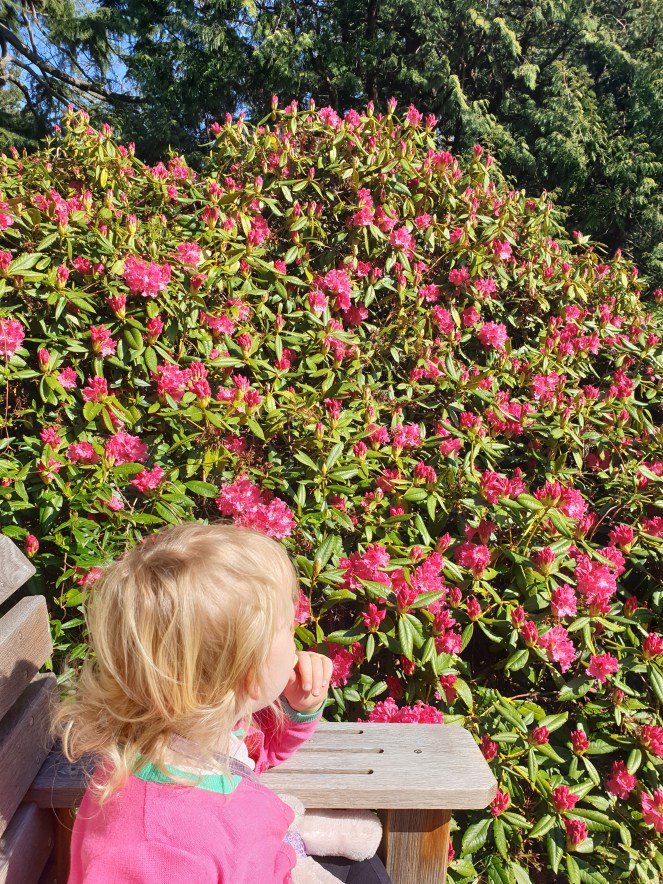 We had a good poke around the Gardens before we found the perfect bench for our pit stop. It was up a hill, beside a fabulous bush full of busy buzzy bees, bathed in sunshine and beside a path where we could do a bit of people watching.