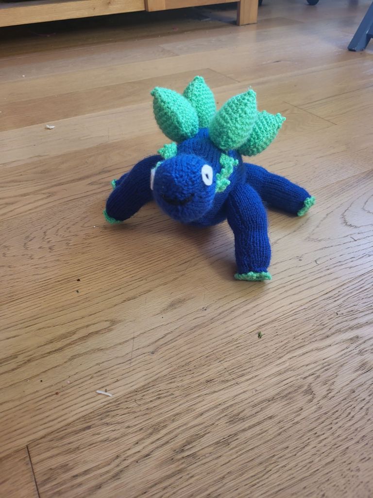 I learned to knit when I was twelve and it’s been something I’ve always loved. I make dolls and stuffed toys rather than anything useful. I knitted a bride and groom for when my eldest sister got married. My middle sister’s sons both got dolls when they were born. I’ve just finished a secret project (which I am so excited about) and I made Wee Daftie a stegosaurus called Sarah.