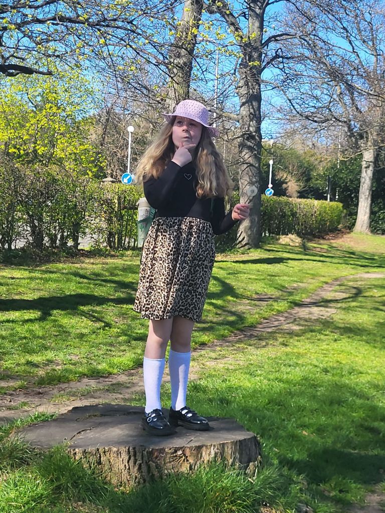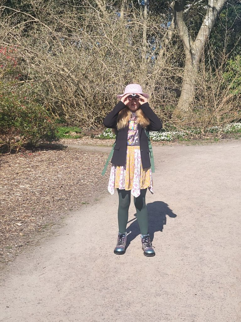 We had a good explore around before picking a lovely bench in the sunshine to create at. Wee Daftie, armed with her binoculars, pens, pencils and paper sketched the trees, herself and the flowers. I sat on the bench, wrote some and watched my girl just enjoy her surroundings.