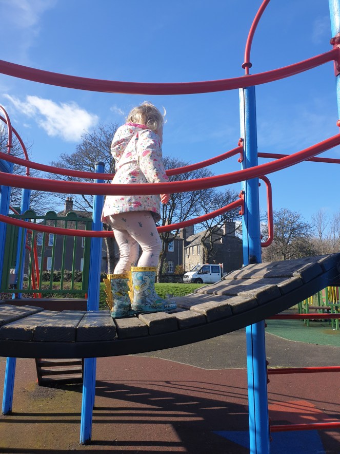 After class today, we got a bus halfway home and then walked the rest ourselves. The big walk to class and our second walk home for lunch took us over our target, which was ace. She might have landed in a mucky puddle on the way home (accidentally) but that didn’t stop us running down a grassy hill at one point.