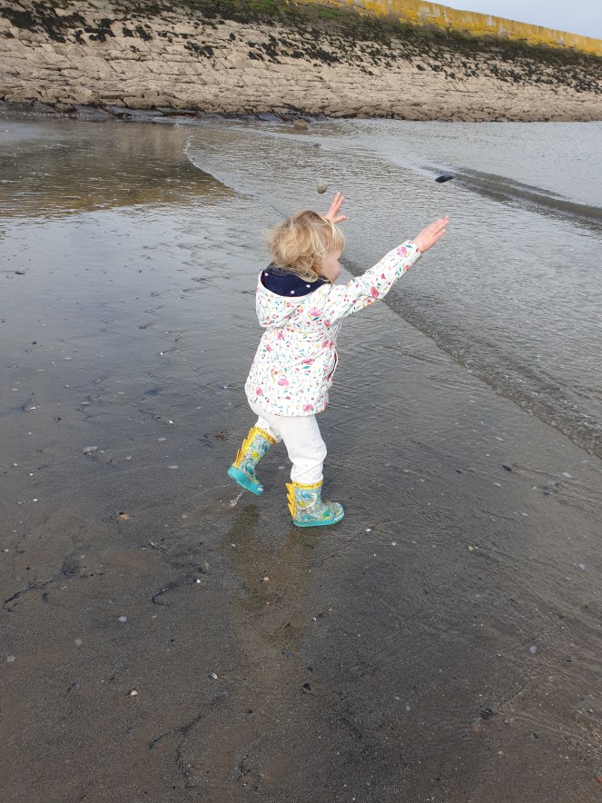 Just beyond the harbour, there is a small pier with some vague sand and lots of stones on either side. It’s a really lovely place to have a wander and throw some stones. Wee Daftie is an expert at the latter.