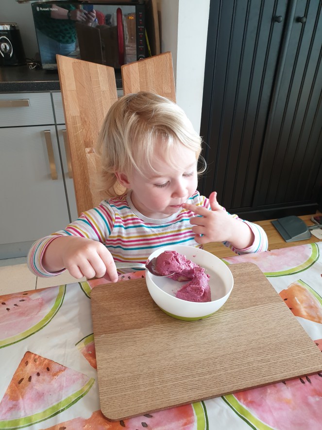 Breaking routine by having some sneaky nice cream – frozen bananas, mixed berries, yoghurt and a splash of maple syrup blended and boom! Ice-cream! But not really. Super, super delicious.
