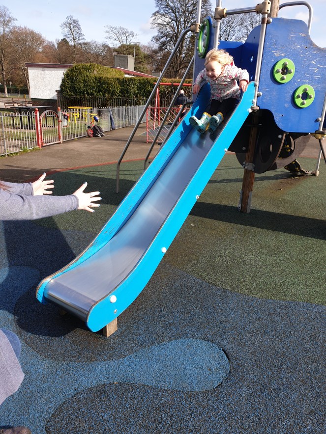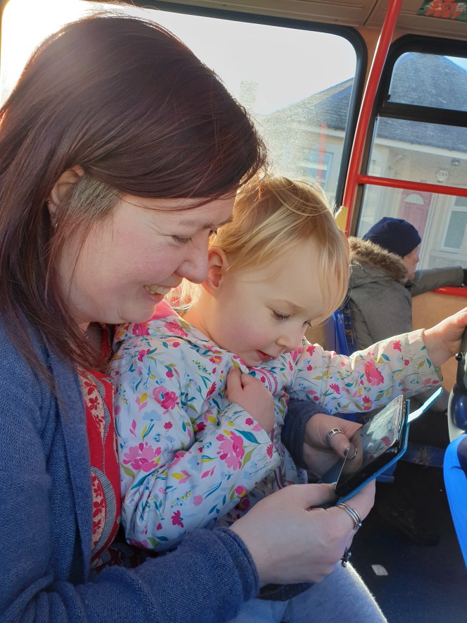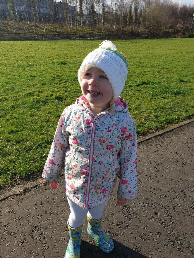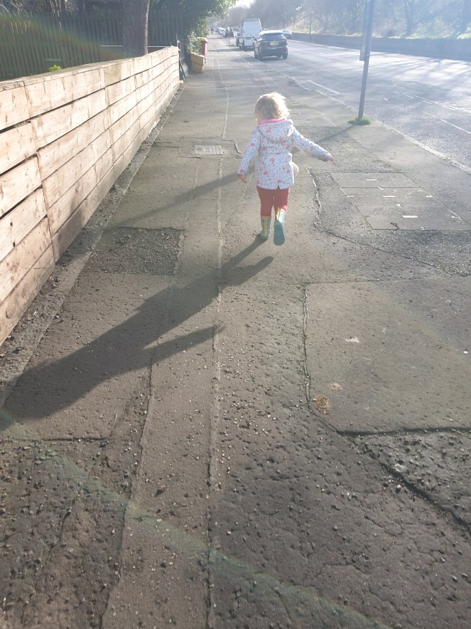 I decided it was worth the risk and we walked to a bus stop a bit further away than necessary. Mainly for the step count but also for the fun of it all. She did a great wee job walking up by herself. I say walking, we ended up playing her favourite game of “Stop and Run!” This is when she shouts, “Stop!” So we stop and then, “1…2…3…Run! Go go go!” Followed by, “Mammy run. Come on Mammy!”