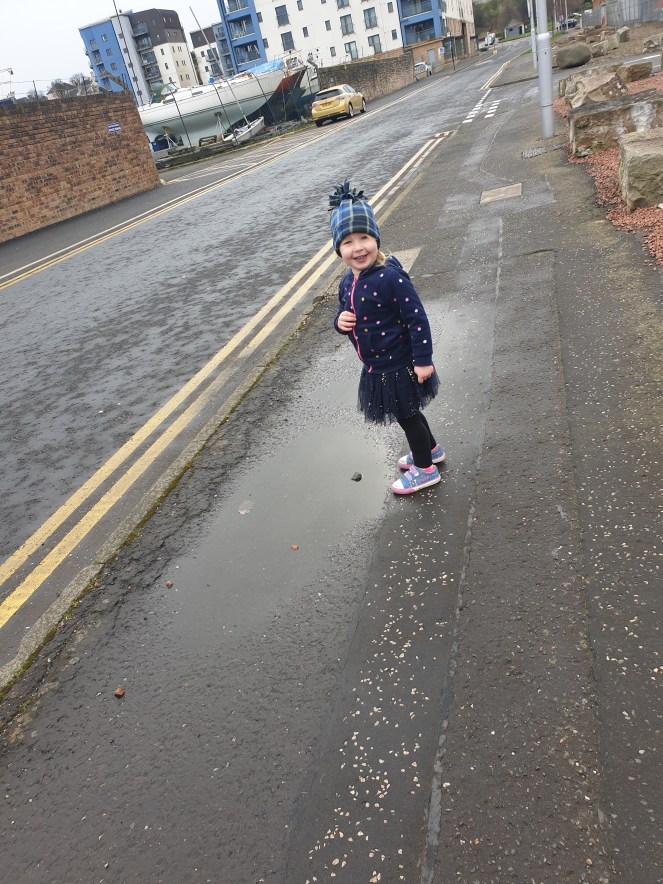 It is scientifically proven that if you want to toddler to walk further than they might normally, just tell them to go puddle jumping! She probably would still be out there if I hadn’t dragged her home.